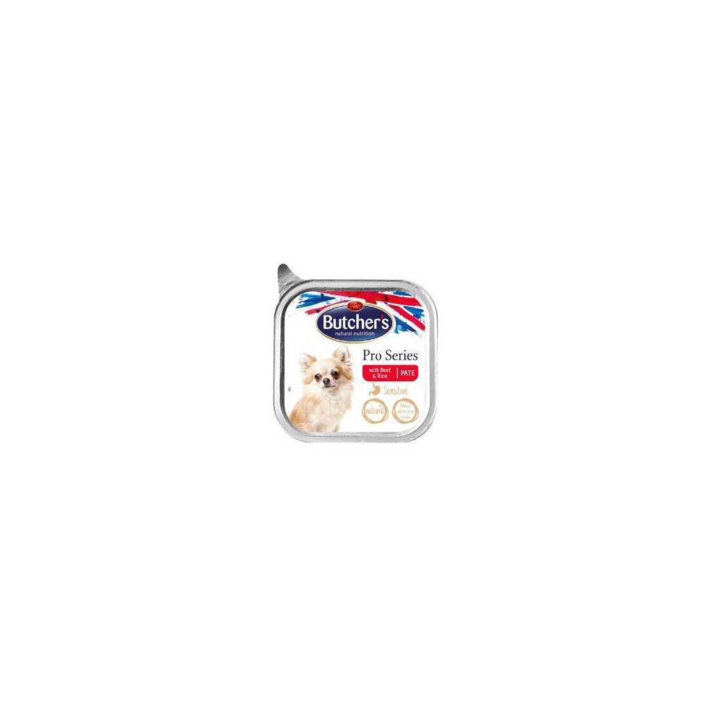 Paštika z hovězího masa Butcher´s je vyrobená ve Velké Británii za použití těch nejkvalitnějších přírodních surovin. Receptura Pro Series SENSITIVE XS je určena pro velmi malé citlivé psy. Pro tyto psy je vanička Butcher´s vynikající volbou, protože obsahuje min, 99 % přírodních ingrediencí. Dále je hovězí paté doplněno o L-Karnitin, který pomáhá převádět tuk na energii, a o vitamíny skupiny E, které podporují celkovou imunita zvířete.