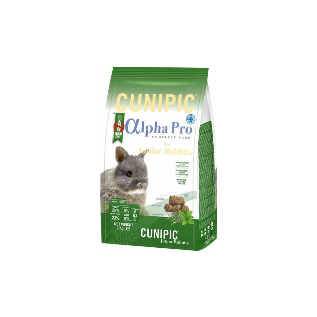 Cunipic Alpha Pro Junior Rabbit – mladý králík. Kompletní krmivo bez obsahu obilovin. Zdravá, velice chutná a vyvážená receptura pro mladé králíky (do 6 měsíců věku). Každá granule obsahuje všechny nezbytné suroviny a vitamíny pro zdraví králíka bez výkyvů v příjmu živin. Krmivo s vysokým obsahem vlákniny (23 %), bez přidaných barviv a cukrů vhodné pro všechna plemena.
