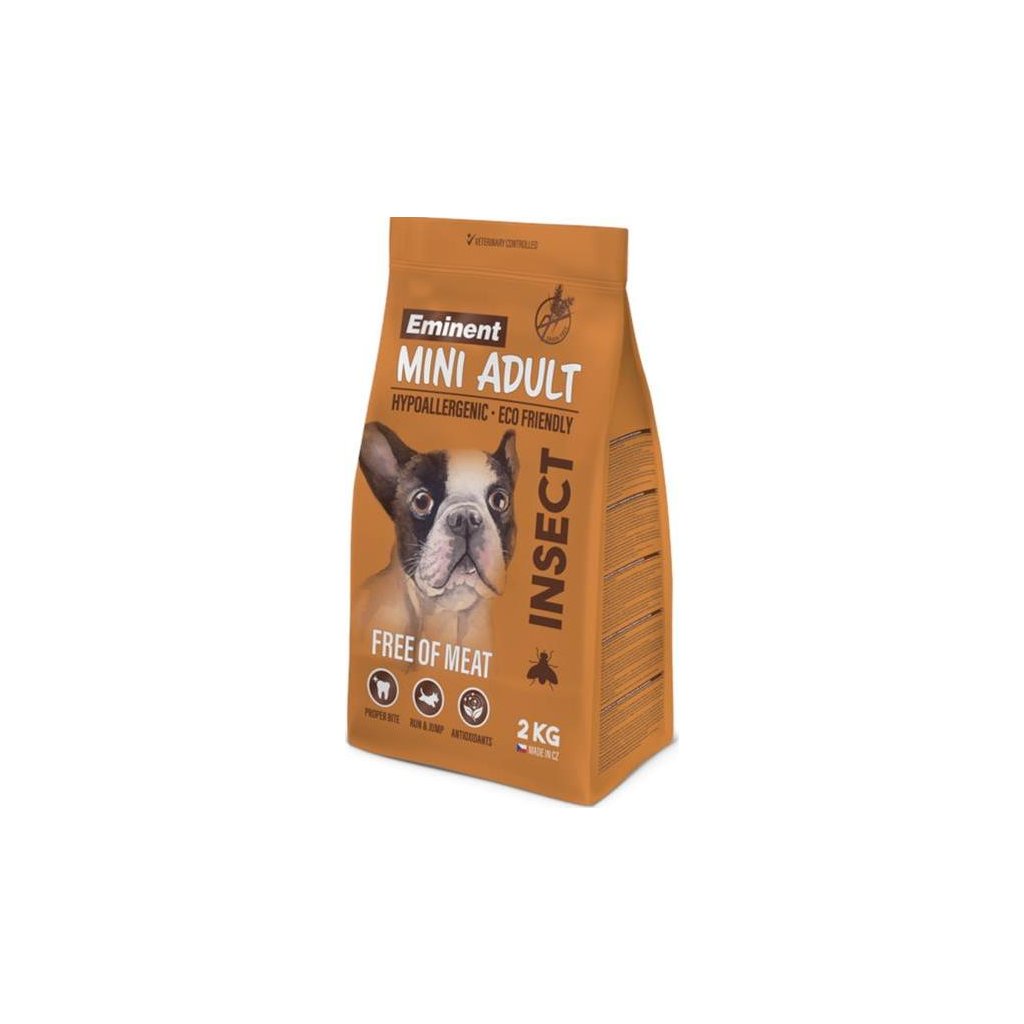 Hypoalergenní kompletní krmivo Eminent Mini Insect je vhodné pro dospělé psy malých a mini plemen, kteří trpí alergiemi na běžně používané zdroje proteinů (hovězí, vepřové apod.). Krmivo neobsahuje maso (pouze drůbeží tuk), aby riziko alergické reakce bylo co nejnižší. Hlavním zdrojem proteinu je hmyz bohatý na kvalitní bílkoviny, vitamíny a minerály. Chov hmyzu je navíc šetrný k životnímu prostředí. Granule jsou obohacené o vejce, mají vyvážený obsah aminokyselin a jsou nutričně hodnotné.