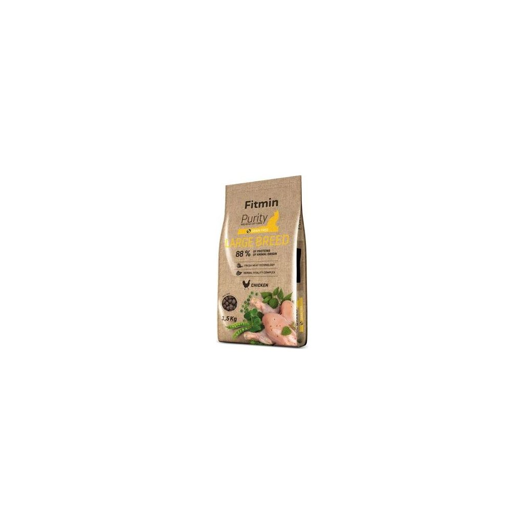 Kulinářský zážitek pro Vaši kočku. To je krmivo Fitmin cat Purity Large Breed. Jedná se o holistické granule pro velké kočky, ve kterých najdete čerstvé kuřecí maso, bylinky na podporu vitality organismu, ovoce i zeleninu. Nejenže uspokojíte mlsné jazýčky Vašich koček, ale zároveň jim poskytnete prvotřídní kvalitu. Krmivo pro velké kočky Fitmin cat Purity Large Breed je tzv. Grainfree krmivo, to znamená, že neobsahuje obiloviny, je bezlepkové, čímž snižuje potencionální riziko výskytu alergických reakcí (např. na pšeničný lepek a kukuřičný gluten). Krmivo je svým unikátním složením a velikostí granule ideální pro kočky velkých plemen jako je Mainská Mývalí kočka, Ragdoll nebo norská lesní kočka. Krmivo Fitmin cat Purity Large Breed pro velké kočky je ve tvaru větší granule, kterou kočka musí rozkousnout. Díky krmivu bude kočka ve vynikající kondici, v neposlední řadě má krmivo důležitou detoxikační funkci díky bylinné směsi, která má ovšem i mnoho dalších blahodárných účinků. Granule pro velké kočky Fitmin cat Purity Large Breed jsou vyráběny nejmodernějšími technologiemi, jsou vyvážené, obsahují vysoký podíl živočišných složek a mnoho dalších benefitů - zejména komplex dentální péče, prebiotika, cheláty a další.