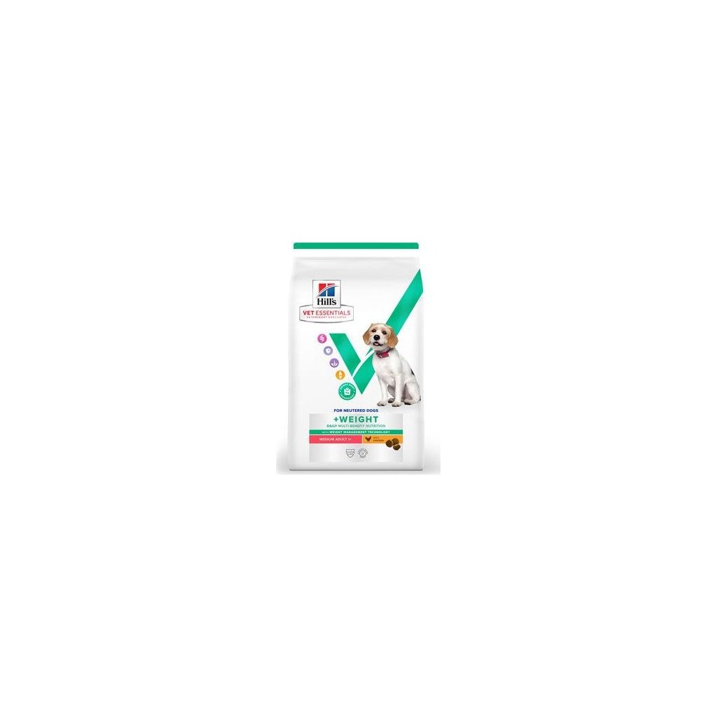Hill's VET ESSENTIALS MULTI-BENEFIT + WEIGHT krmivo s kuřetem pro dospělé psy středně velkých plemen starší 1 roku je kompletní, všestranně prospěšná výživa pro dospělé a starší dospělé psy. Poskytuje klinicky ověřené klíčové výhody pro vašeho psa, včetně klinicky ověřené technologie regulace hmotnosti na podporu spalování tuků a pomáhá vašemu psovi při dosažení a udržení optimální hmotnosti po kastraci. Neodolatelná chuť, kterou bude váš pes milovat.