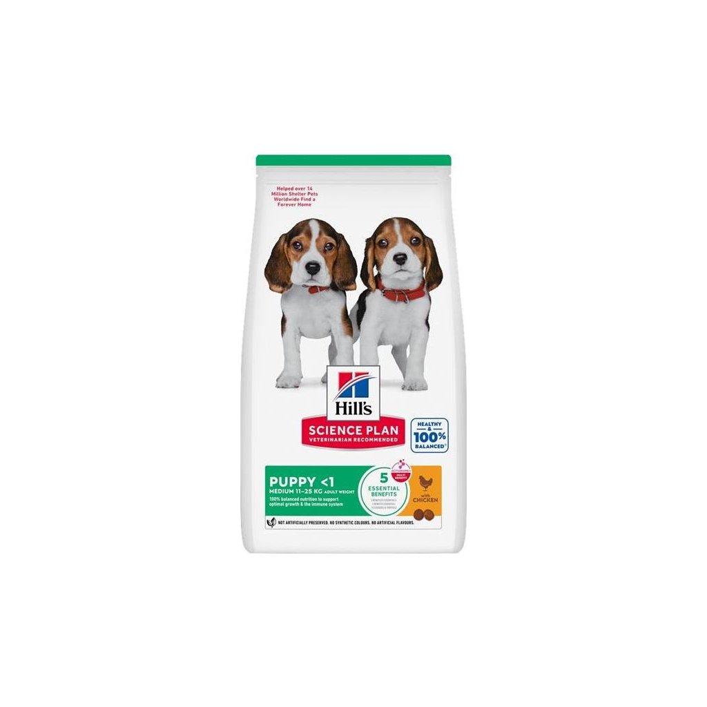 Hill's Science Plan Puppy Medium je krmivo s kuřetem pro štěňata středně velkých plemen a představuje lahodnou, zdravou a vyváženou stravu pečlivě navrženou pro vývojové potřeby psích mláďat. Granule obsahují vyváženou směs minerálních látek pro silné zuby a kosti, omega-3 mastnou kyselinu DHA z rybího oleje pro zdravý vývoj mozku a očí, vysoce kvalitní bílkoviny pro tvorbu svalové hmoty a také ingredience pro zdravé trávení. Patentovaná směs prebiotik ActivBiome+ Multi-Benefit vyživuje střevní mikrobiom, čímž podporuje funkce zažívacího traktu i celkovou pohodu vašeho mazlíčka.