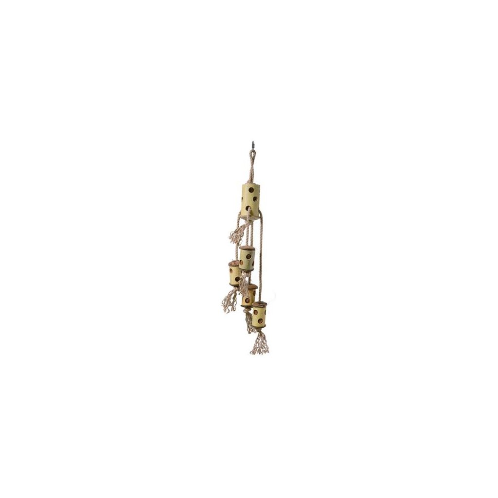Ručně vyráběná závěsná hračka z přírodních materiálů je ideální pro středně velké papoušky. Duté bambusové trubičky lze využít k ukrytí pamlsků a podpořit tak přirozené chování, jako je šplhání, ozobávání, hledání potravy a houpání. Hračka je vyrobena z bambusu, kokosových vláken a jutového provázku, bez použití barviv. Bezpečná kovová karabinka umožňuje snadné zavěšení do klece nebo voliéry. Všechny použité materiály jsou netoxické a bezpečné.