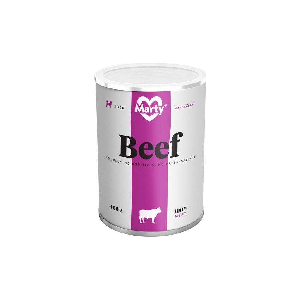 MARTY konzerva pro psy ze 100% masa - hovězí. Nabízí psovi možnost stravy z čistého a stoprocentního masa bez zatížení konzervanty a dochucovacími či barvícími přísadami. Krmivo neobsahuje sóju, mouku, rýži ani jiné přísady.
