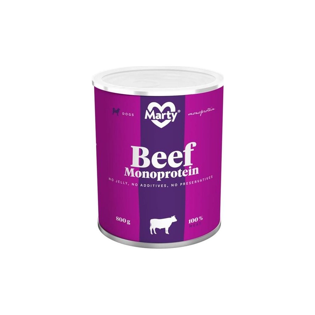 MARTY Monoprotein Hovězí maso. Jednosložková krmná surovina pro psy ve formě 100% čistého hovězího masa nabízí psovi možnost stravy z čistého masa bez jakéhokoliv zatížení přidanými konzervanty nebo jinými přísadami. Přítomnost čistě hovězího masa neutralizuje riziko alergické reakce na případné jiné druhy masa.