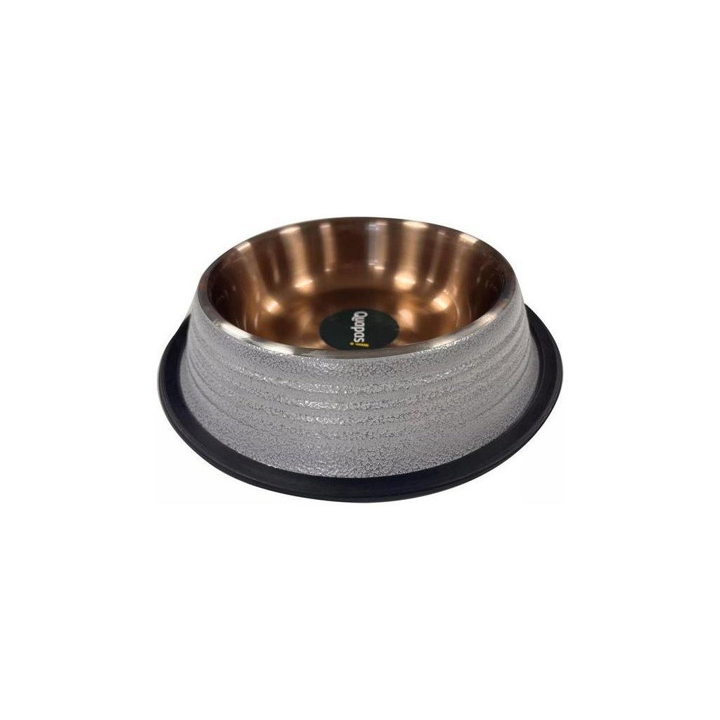 Miska na krmivo nebo vodu pro psy a kočky je vyrobená z nerezové oceli s měděnou povrchovou úpravou. Spodní okraj je opatřený gumovým lemem, který zabraňuje klouzání a snižuje riziko rozlití. Vhodná pouze pro ruční mytí.