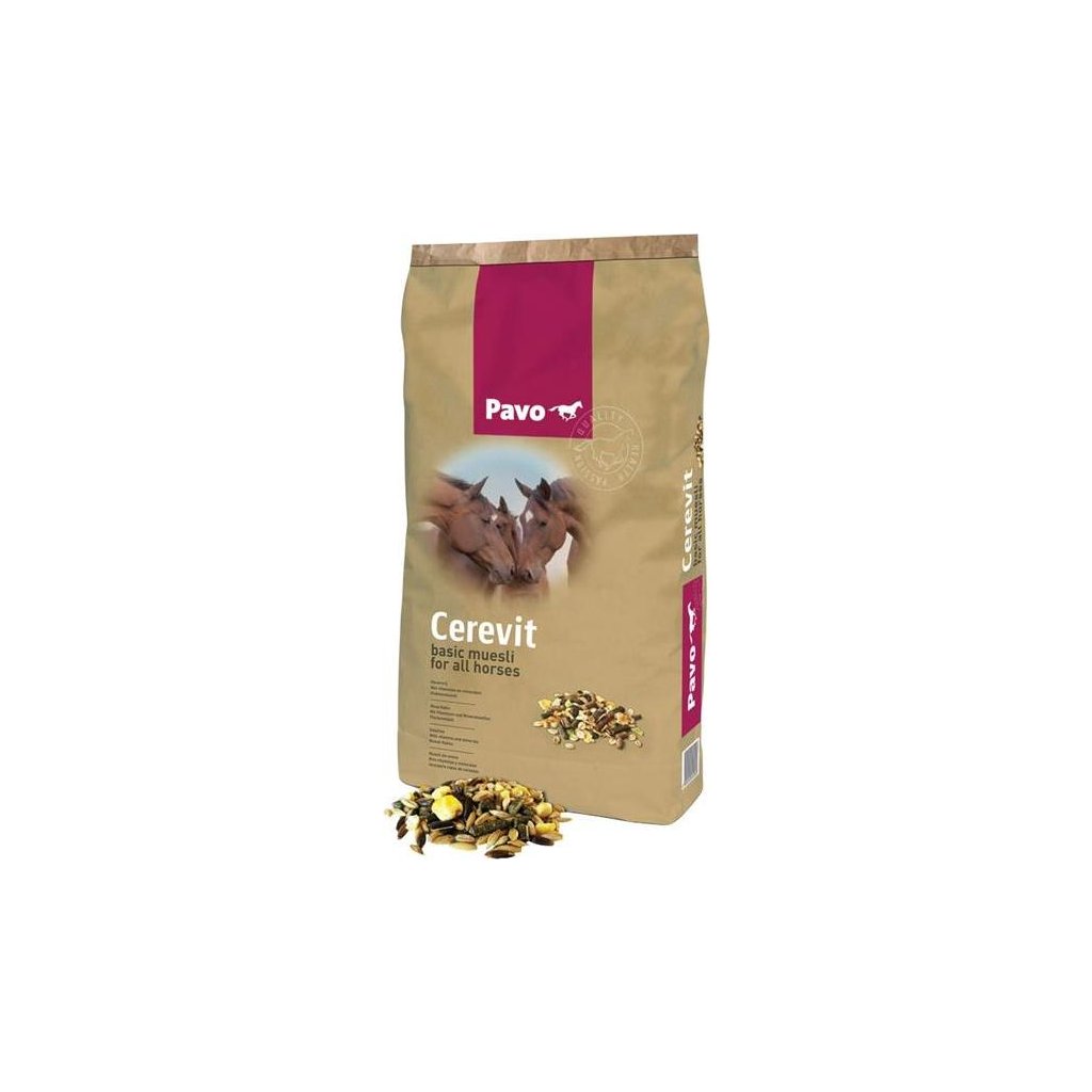 Pavo Cerevit je vysoce stravitelné müsli s vločkovanými a celými zrny. S tímto krmením můžete vašemu koni dát všechny potřebné vitamíny a minerály pro dobré zdraví. Toto müsli je velmi pečlivě zkombinováno, neobsahuje oves a má nízký obsah proteinů. Pavo Cerevit je základní müsli pro všechny koně a poníky.
