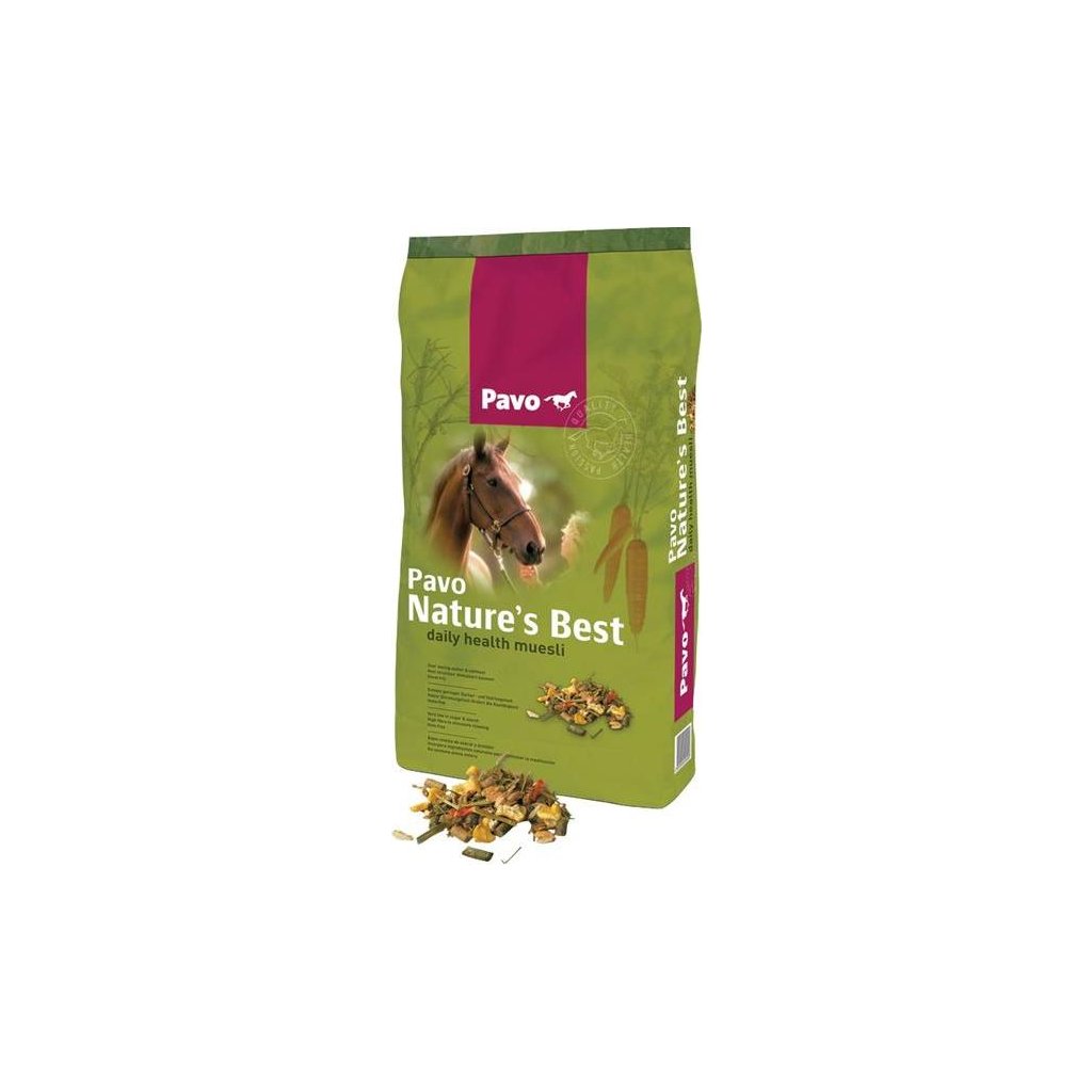 Pavo Nature´s Best je extrémně chutné na strukturu bohaté muesli s kousky mrkve, pšenicí špaldou a na slunci sušenou vojtěškou. Tyto složky v Pavo Nature´s Best stimulují přirozené žvýkání vašeho koně nebo pony. Je to kompletní (ve smyslu obsahuje vše potřebné) doplňkové (ve smyslu doplněk k objemnému krmivu) energetické krmivo s optimálním složením přírodních složek, vitaminů, mikroprvků a minerálních látek. Pavo Nature´s Best neobsahuje oves, má velmi nízký obsah dusíkatých látek a není přidaný cukr, protože neobsahuje melasu. Proto je Pavo Nature´s Best velmi vhodné pro koně, kteří mají přirozeně „horkou hlavu“ nebo pro koně a pony, kteří mají sklon ke schvácení kopyt.