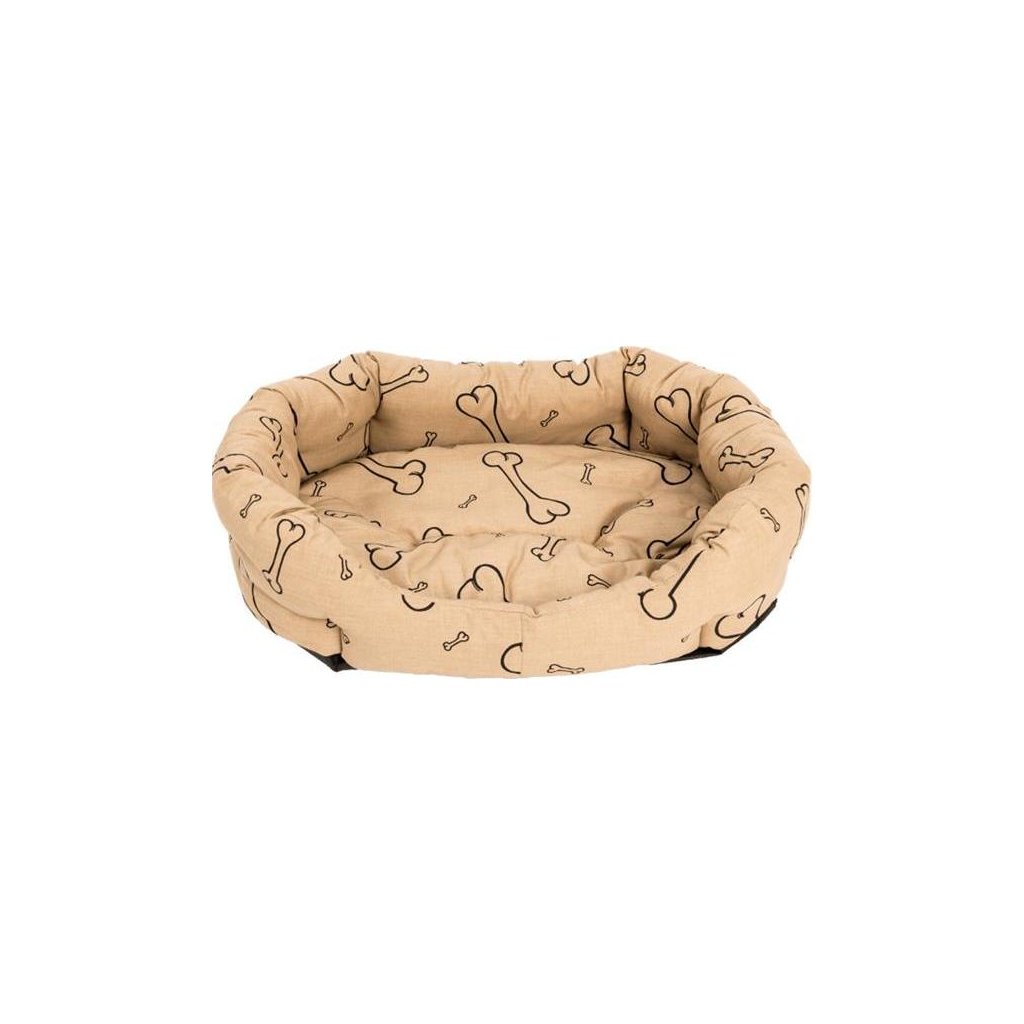 Pohodlný, kvalitní pelech vyrobený z bavlněné látky s potiskem kostí, vyplněný dutým vláknem. Pelíšek je v několika bodech prošitý, aby nedošlo k nerovnoměrnému rozmístění výplně. Polštářek je vyjímatelný. Boky pelíšku jsou kvůli dobré opoře bohatě vyplněny. Pelech se lehce udržuje.