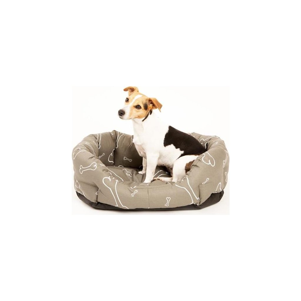 Pohodlný, kvalitní pelech vyrobený z bavlněné látky potištěné kostmi a kostičkami, vyplněný dutým vláknem. Pelíšek je v několika bodech prošitý, aby nedošlo k nerovnoměrnému rozmístění výplně. Polštářek je vyjímatelný. Boky pelíšku jsou kvůli dobré opoře bohatě vyplněny. Pelech se lehce udržuje.
