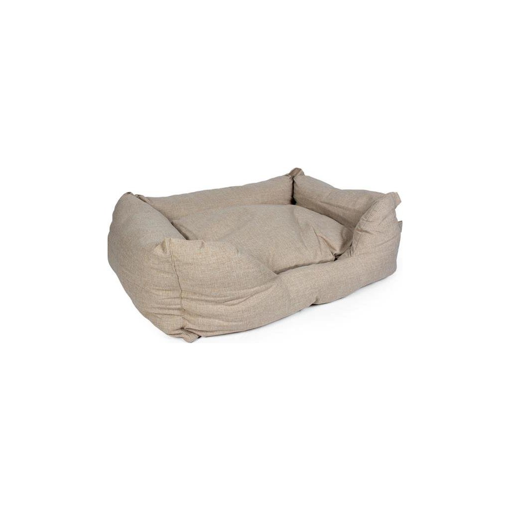 Stylový pelech nabízí psovi pohodlné místo pro klidný spánek a odpočinek. Široké boky zajišťují dostatečnou podporu. Výplň je vyrobena ze 100% recyklovaných materiálů. Pevný potah z vysoce kvalitního polyesteru díky zipům jednoduše svléknete a vyperete v pračce. Pelech má protiskluzové dno.