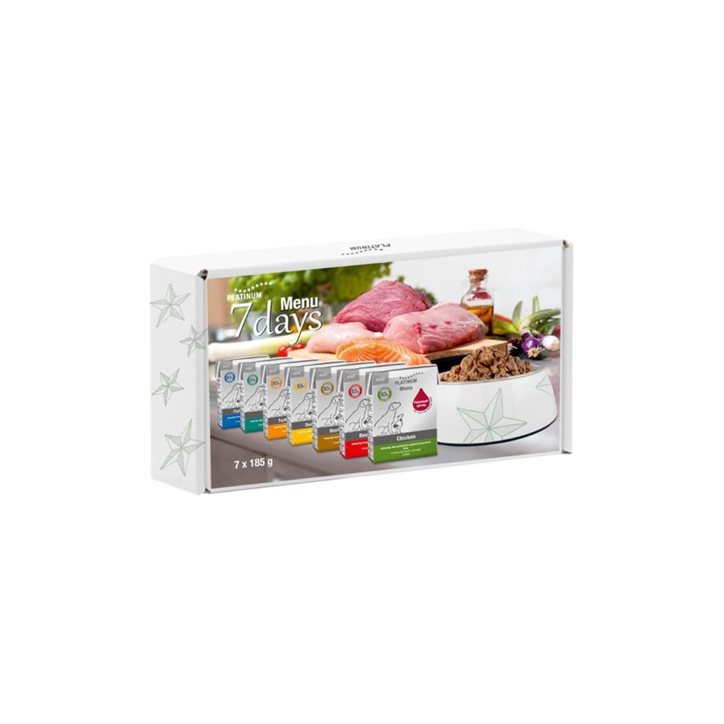 Paštiky v balení na týden Platinum 7days Menu obsahují 83 % čerstvého masa. Díky jedinečné metodě přípravy Fleischsaftgarung si maso uchová plnou chuť, vůni a všechny důležité živiny. Přísady se pomalu vaří za nízkých teplot uzavřené v obalu Tetra Recart. Všechna šťáva tak zůstane uvnitř, včetně vitamínů a minerálů. Receptury s vyváženým složením vyhovuje i psům s citlivým zažíváním.