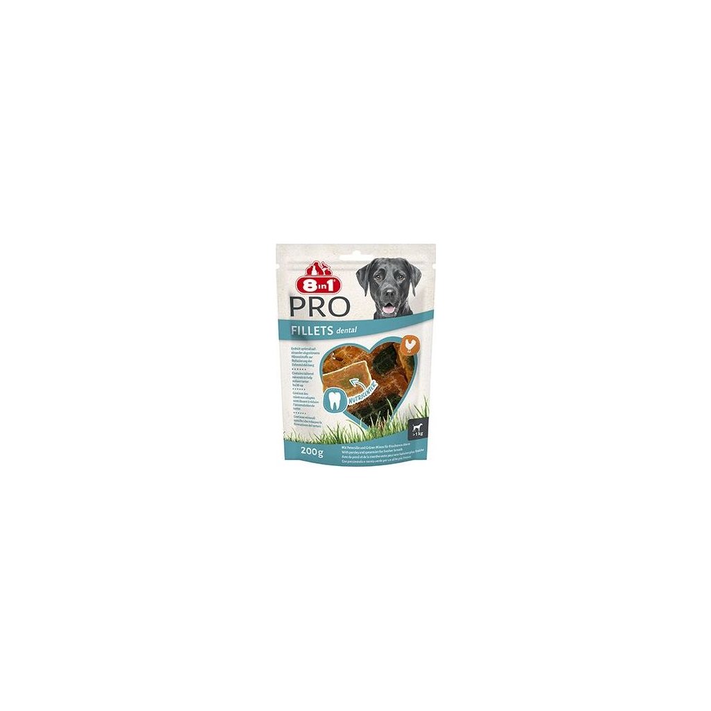 Pamlsky 8in1 Fillets Pro Dental jsou lahodné pamlsky prémiové kvality, které navíc osvěžují dech. Pamlsky 8in1 Fillets Pro nejsou jen mimořádně chutné, ale navíc jsou pro vašeho psa lahodnou pochoutkou s přidanou hodnotou. Skládají se z chutných kuřecích prsou se speciální výživnou náplní Nutri-Centre, která obsahuje zdravé a funkční přidané složky podporující pohodu a vitalitu psa. Jedinečná náplň Nutri-Centre obsahuje speciálně přizpůsobené minerály, které omezují tvorbu zubního kamene, a je obohacena o petržel a mátu peprnou pro svěžejší dech. 8in1 Fillets Pro Dental mají nízký obsah tuku a vysoký obsah bílkovin, takže jsou skvělou zdravou odměnou mezi krmením. Navíc jsou vyrobeny bez umělých dochucovadel a konzervačních látek. Uzavíratelný sáček zajistí delší čerstvost a vy si pamlsky můžete snadno vzít s sebou, když jste na cestách.