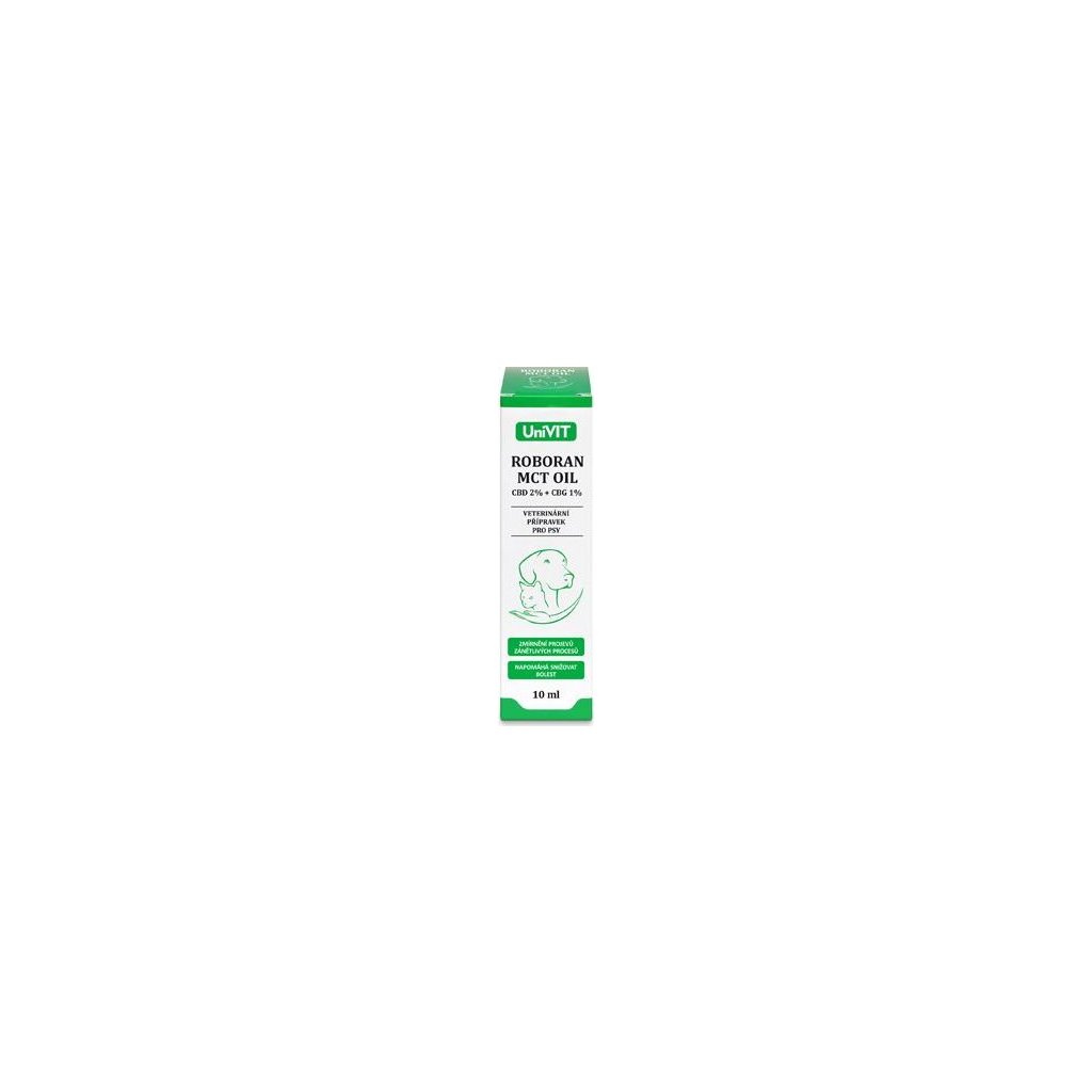 Roboran MCT OIL CBD 2% + CBG 1% je schválený veterinární přípravek, ve formě kapek využívající široké spektrum účinků přírodního kanabidiolu a kanabigerolu. Kanabinoidní složky jsou rozpuštěny v MCT oleji, který je získáván šetrně z kokosového oleje.