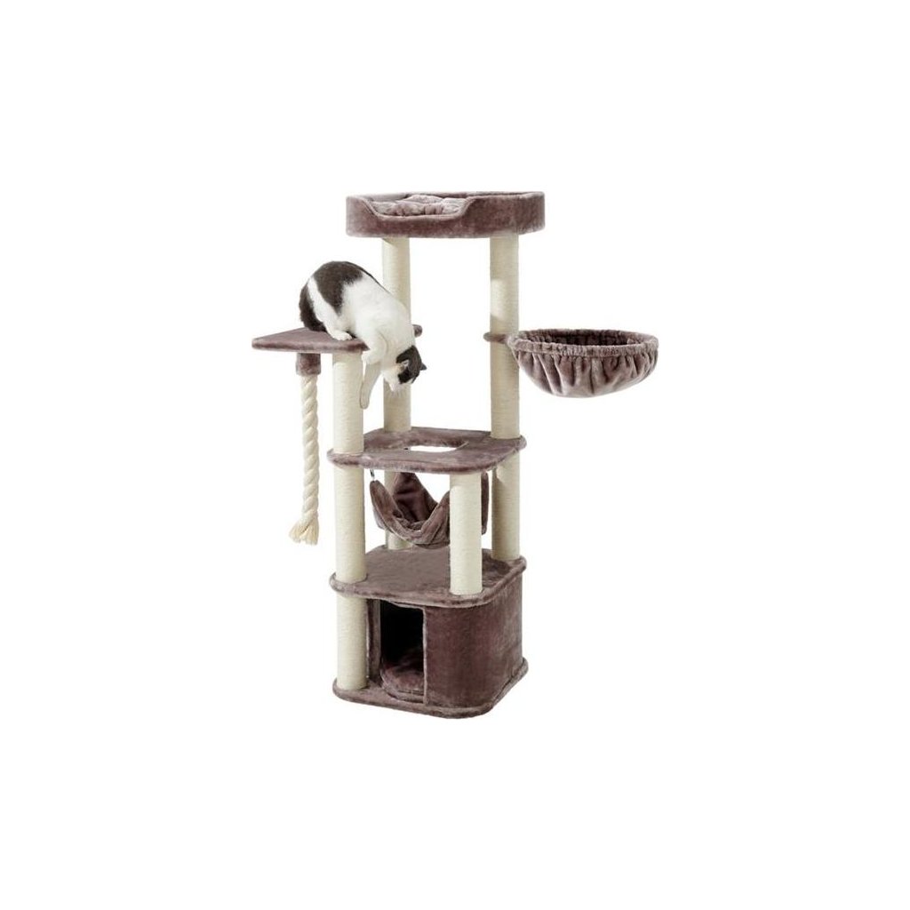 Škrabadlo je vyvedené v elegantní krémové barvě s robustní konstrukcí. Obsahuje kmeny se sisalem, lenošku, měkký domeček, kvalitní provaz, závěsnou hamaku a horní odpočívadlo s polštářkem.