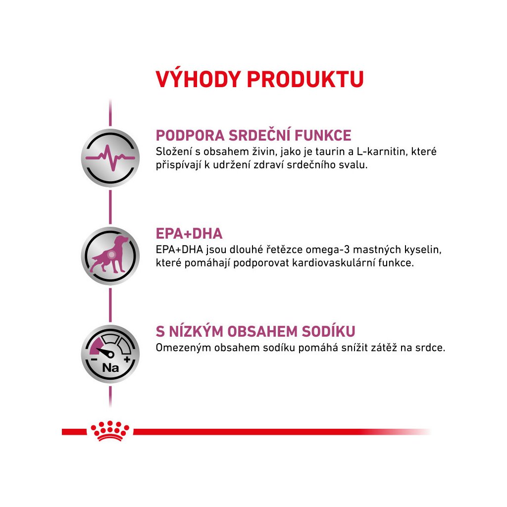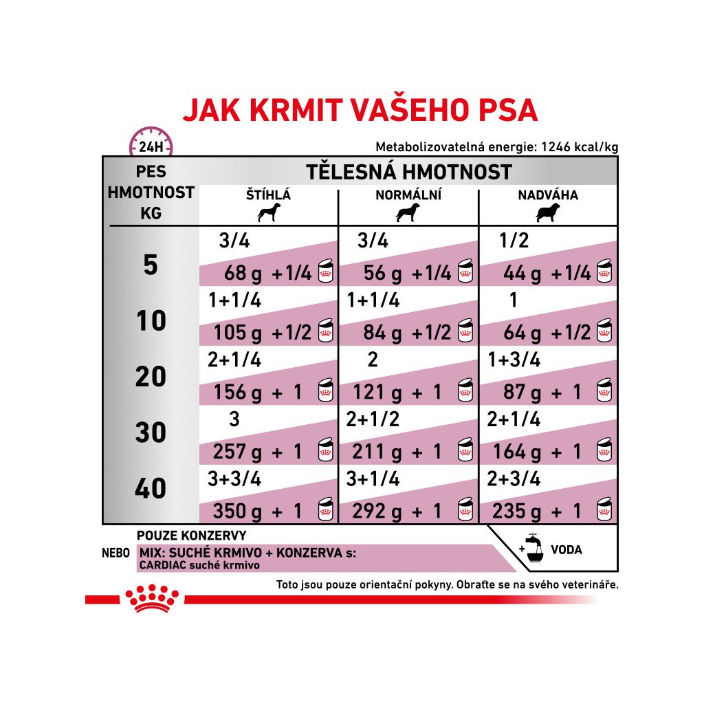 Podpořte zdraví srdce svého psa pomocí ROYAL CANIN® Cardiac: ROYAL CANIN® Cardiac je přesně vyvážená, výživná strava, která je speciálně vytvořena tak, aby pomohla podpořit zdraví srdce vašeho psa.Speciální veterinární dieta v podobě konzervovaného krmiva pro dospělé psy trpící srdeční nedostatečností a vysokým krevním tlakem. Různá srdeční onemocnění, např. srdeční nedostatečnost či hypertenze, jsou u psů často spojována také se ztrátou chuti k jídlu a následným nechtěným úbytkem hmotnosti. Navíc zvyšují i riziko vzniku chronické ledvinové nedostatečnosti (CNI). Speciální dieta napomáhá redukovat oxidativní metabolické reakce, podporuje prokrvení tkání a vazodilataci.