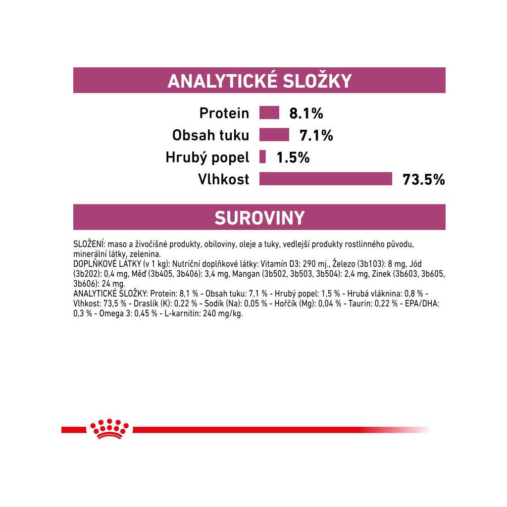 ANALYTICKÉ SLOŽKY: Protein: 8,1 % - Obsah tuku: 7,1 % - Hrubý popel: 1,4 % - Hrubá vláknina: 0,8 % - Vlhkost: 73,5 % - Draslík (K): 0,21 % - Sodík (Na): 0,05 % - Hořčík (Mg): 0,04 % - Taurin: 0,22 % - EPA/DHA: 0,3 % - Omega 3: 0,45 % - L-karnitin: 240 mg/kg.