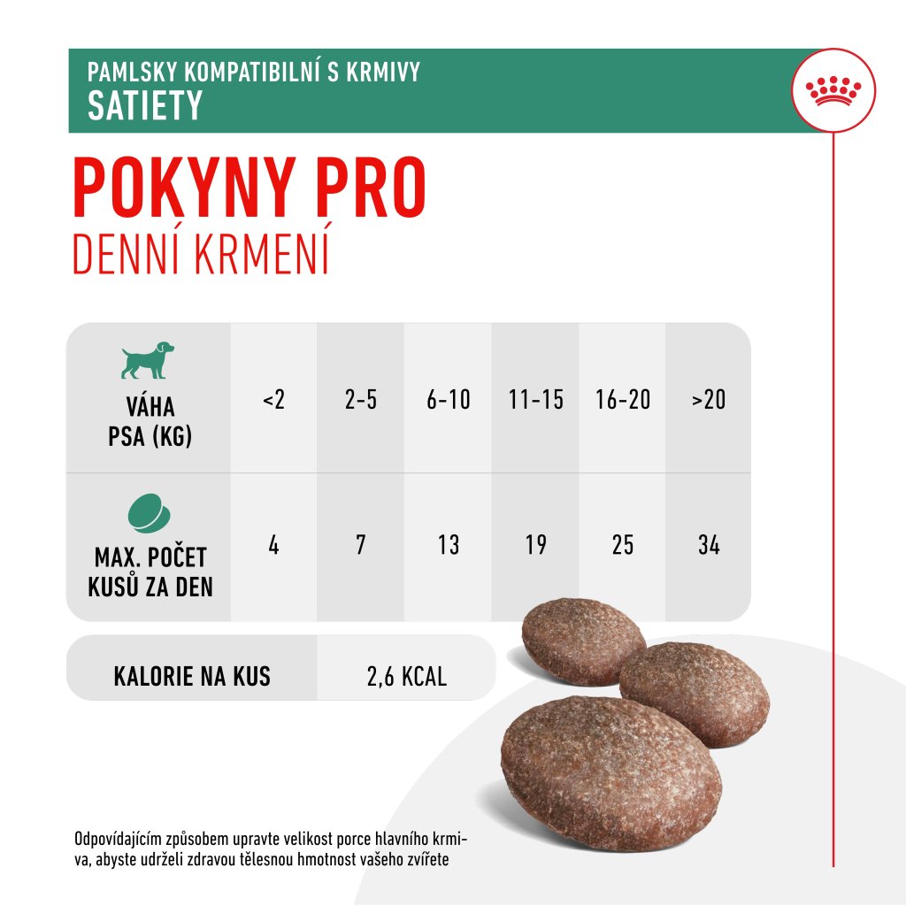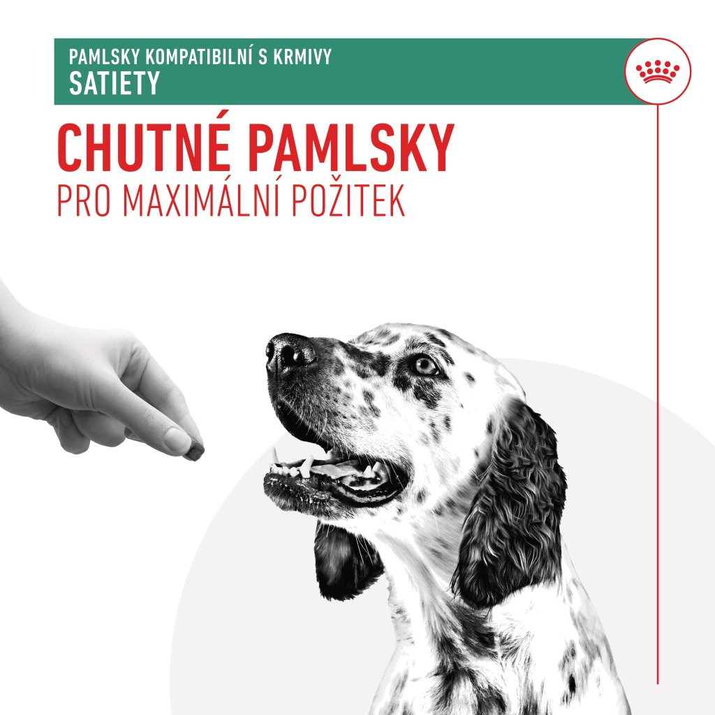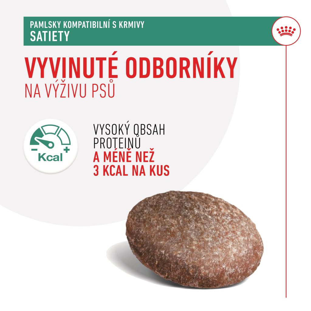 Užijte si chvíle se svým psem a těmito chutnými dobrotami. Pokud jde o zdraví a pohodu vašeho psa, víme, že chcete jen to nejlepší. Proto jsme vytvořili Pamlsky ROYAL CANIN® Satiety, abyste mohli odměňovat svého psa, aniž byste narušovali zdravotní přínosy jeho pečlivě vyváženého hubnoucího dietního plánu. Vyvinuto odborníky na psí výživu. Tyto měkké žvýkací pamlsky jsou vhodné pro dospelé psy. Pamlsky ROYAL CANIN® Satiety mají méně než 3 kcal v jednom kousku a obsahují vysoké množství bílkovin, a proto jsou skvělou volbou pro psy konzumující redukční dietu. Když odměňujete svého psa Pamlsky ROYAL CANIN® Satiety, nedáváte mu jen dobrotu; aktivně podporujete jeho veterinární dietní plán. Řiďte se pokyny ke krmení na balení a nedávejte svému psovi více pamlsků, než je doporučeno. Když odměňujete svého psího společníka, doporučujeme vhodně upravit velikost porce jeho hlavního jídla, aby si zachoval zdravou váhu. Pamlsky ROYAL CANIN® Satiety jsou vhodné k následujícím dietám Satiety z naší veterinární řady ROYAL CANIN®, které by měly být podávány pouze na doporučení veterináře: ROYAL CANIN® Satiety, ROYAL CANIN® Satiety Small Dog. Pokud máte jakékoliv dotazy nebo obavy o zdraví svého psa, poraďte se prosím s veterinářem.