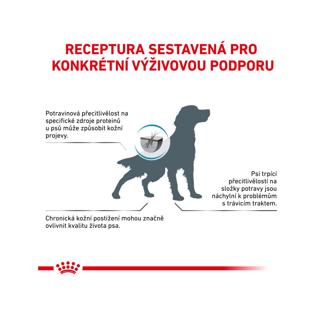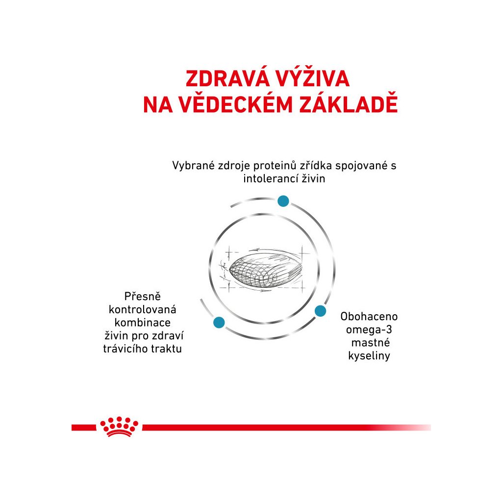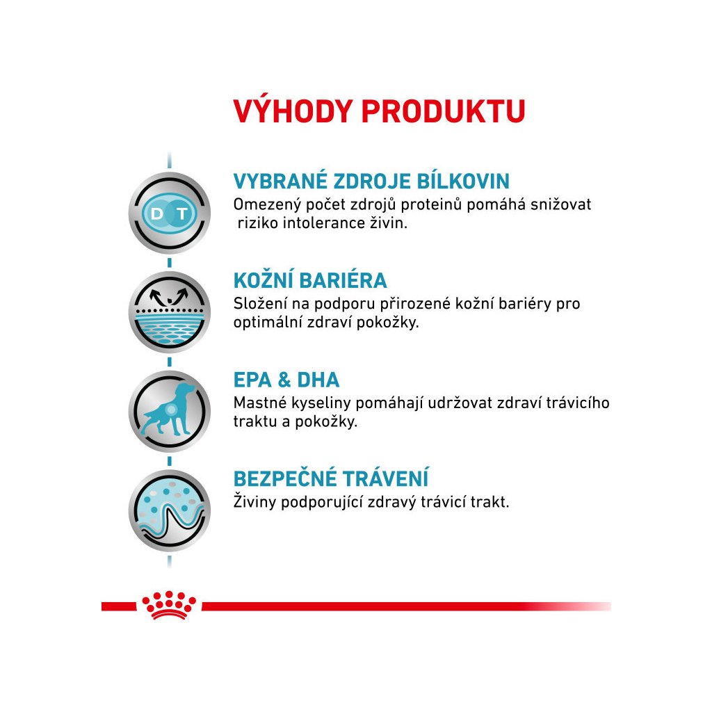 Speciální veterinární dieta pro dospělé psy trpící potravinovými intolerancemi určitých komponentů a živin.
