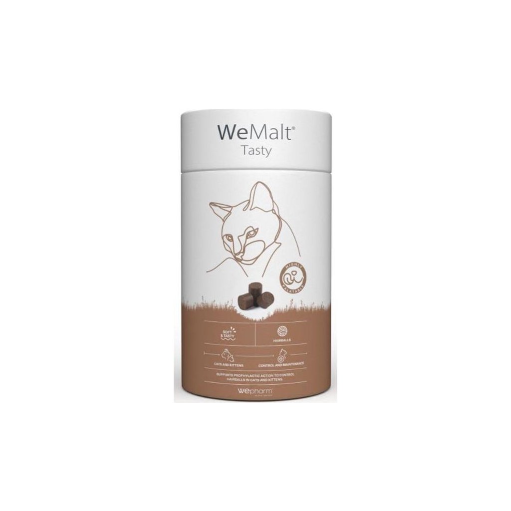 WeMalt Tasty je chutný pamlsek pro kočky a koťata, který pomáhá předcházet tvorbě chlupových chomáčků v žaludku. Při každodenní péči o srst dochází ke spolknutí chlupů, které se mohou hromadit a způsobovat nepříjemnosti. WeMalt napomáhá jejich přirozenému průchodu zažívacím traktem a tím chrání kočku před zvracením srsti a dalšími obtížemi.